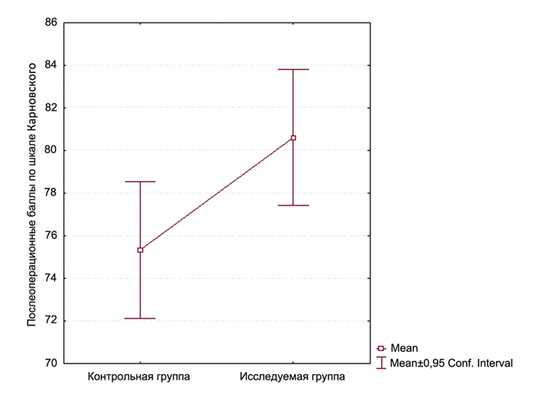 При проведении анализа исходов по шкале Карновского, медиана оценки качества жизни у пациентов контрольной группы равнялась 75,33 (ст. отклонение ± 8,60), в то время как у пациентов основной группы - 80,6. (Рис.2). Проведенное с помощью теста Мана-Уитни исследование показало статистическую достоверность данного отличия (p=0,01).
