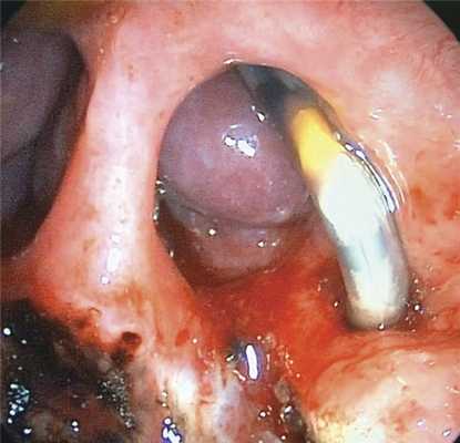 Рис. 1. Эндофотография носоглотки после эндоскопической аденотомии и лазерной деструкции трубных валиков. Баллон проведен через полость носа и установлен в устье слуховой трубы.