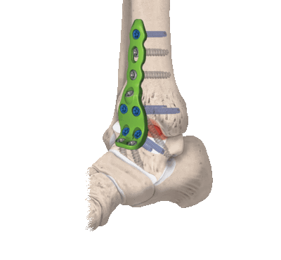 В данном случае применяются все виды оперативного лечения, но наиболее актуален внутрисуставной метод. Популярен артродез голеностопного сустава пластиной, при котором облегчается установка угла между большеберцовой костью и голенью.