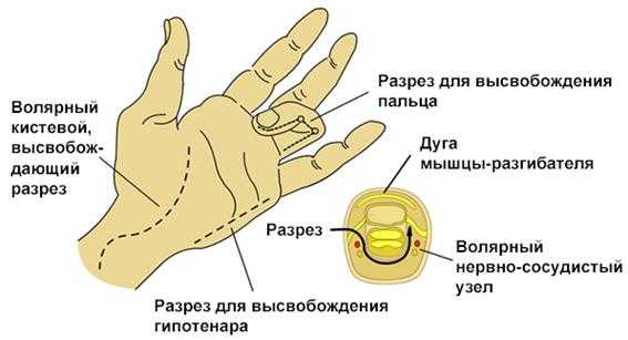 г. Разрез в медиальной части мизинца для высвобождения гипотенара.