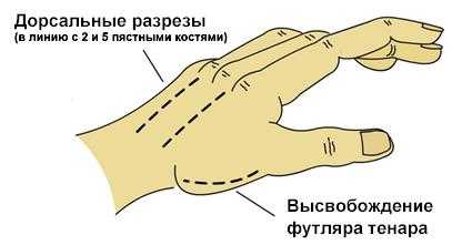 б. Дорсальный разрез над пястной костью указательного пальца высвобождает
