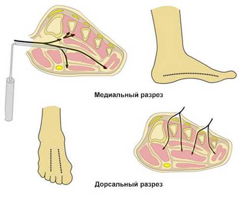в. Чтобы сохранить дорсальные мягкие ткани, можно сделать один разрез (медиально к стопе через медиальный футляр, через центральный футляр
