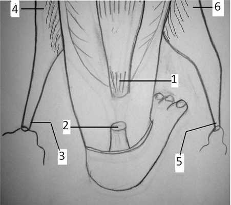 Предложенный способ иллюстрируется графическим материалом. На рис. 1 показаны Рис. 1. Выделение короткой малоберцовой и задней большеберцовых мышц. 1 — проксимальный конец ахиллова сухожилия; 2 — дистальный конец ахиллова сухожилия; 3 — сухожилия короткой малоберцовой мышцы; 4 — малоберцовая мышца; 5 — сухожилия задней большеберцовой мышцы; 6 — задняя большеберцовая мышца. проксимальный конец (1) и дистальный конец (2) ахиллова сухожилия. Выделено и взято на держалку сухожилие (3) короткой малоберцовой мышцы (4). Выделено и взято на держалку сухожилие (5) задней большеберцовой мышцы (6).