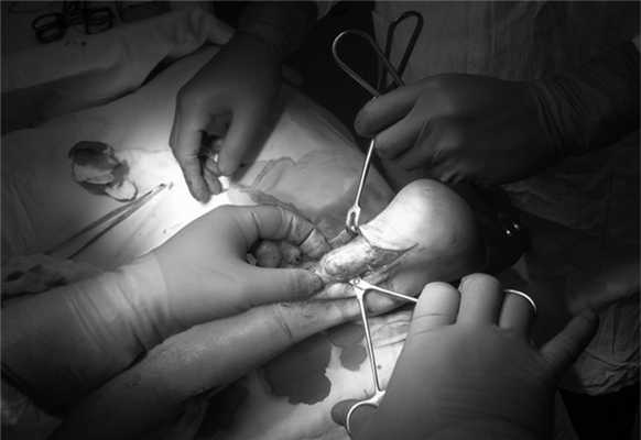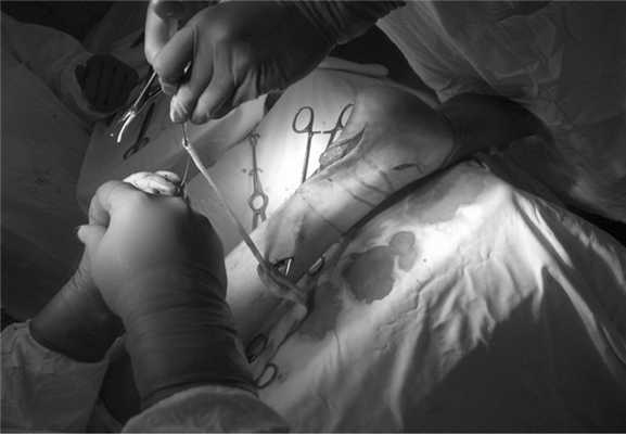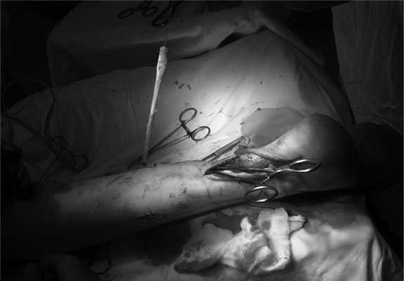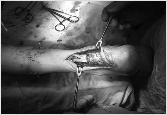 Далее выполнен разрез длиной 3 см по внутренней поверхности в средней трети голени для выделения сухожилия задней большеберцовой мышцы (рис. 5). Рис. 5. Выделение сухожилия задней большеберцовой мышцы.