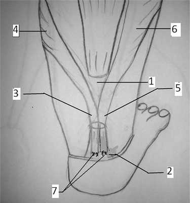 На рис. 2: Рис. 2. Перемещение и пластика дефекта ахиллова сухожилия. 1 — проксимальный конец ахиллова сухожилия; 2 — дистальный конец ахиллова сухожилия; 3 — сухожилия короткой малоберцовой мышцы; 4 — малоберцовая мышца; 5 — сухожилия задней большеберцовой мышцы; 6 — задняя большеберцовая мышца; 7 — швы, фиксирующие концы ахиллова сухожилия. сухожилие (3) короткой малоберцовой мышцы (4) и сухожилие (5) задней большеберцовой мышцы (6) проведены через трехглавую мышцу, перекрывают дефект между проксимальным концом (1) и дистальным концом (2) ахиллова сухожилия, натянуты до оптимального натяжения и фиксированы швами (7) параллельно друг другу к дистальному концу (2) ахиллова сухожилия.