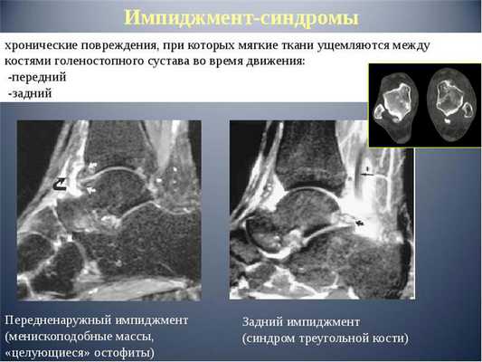 Наиболее часто данная патология связана с образованием остеофитов по передней поверхности большеберцово-таранного сустава. Помимо переднего выделяют наружный, внутренний и задний импинджмент большеберцово-таранного сустава, которые связаны с избыточным разрастанием мягких тканей по передне-наружной или задней поверхности голеностопного сустава или костными повреждениями данных областей, они будут рассмотрены отдельно. Передний большеберцово-таранный импинджмент наиболее часто встречается у рэгбистов, футболистов и танцоров.