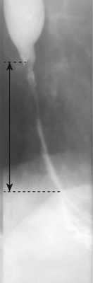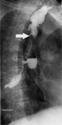 По данным эзофагоскопии, от верхней трети пищевода его слизистая отечна, белесая, с множественными рубцами. На расстоянии 35 см от резцов выявлена циркулярная язва, покрытая фибрином, и стриктура, суживающая просвет пищевода до 0,4 см. Осмотреть дистальные отделы пищевода и желудок стандартным эндоскопом на данном этапе не удалось. Рентгенография: протяженность рубцовой стриктуры до 12 см. Она захватывает нижнюю и среднюю треть пищевода. Супрастенотически пищевод расширен до 4 см (рис. 1). Патологических изменений в желудке не выявлено.