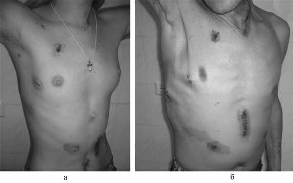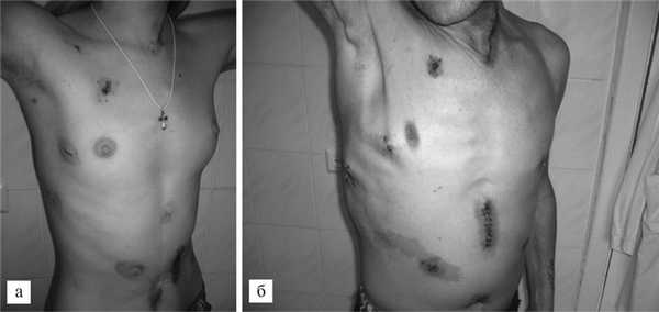 Рис. 2. Фотографии больных после видеоторакоскопической экстирпации пищевода с одномоментной видеолапароскопической эзофагогастропластикой при наличии гастростомы (а) и без нее (б).