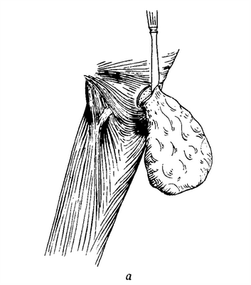 Рис. 3-131. Ценкеровский шейный пограничный дивертикул. а) Выделенный слева ценкеровский дивертикул, б) миотомия шейной части пищевода и резекция дивертикула, в) поперечные швы пищевода и продольная мио-томия