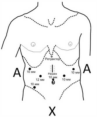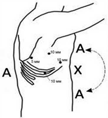 Рис. 2. Схема расположения бригады хирургов и расстановки троакаров при выполнении торакального этапа операции (положение на левом боку). Здесь и на рис. 3: Х - хирург; А - ассистент.