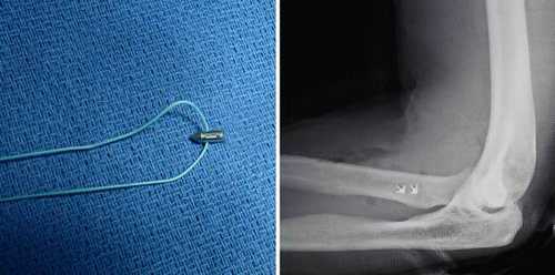 (Слева) Нить и шовный якорь. (Справа) Рентгенограмма локтевого сустава в боковой проекции, на которой видны два шовных якоря, установленные в лучевую кость.
