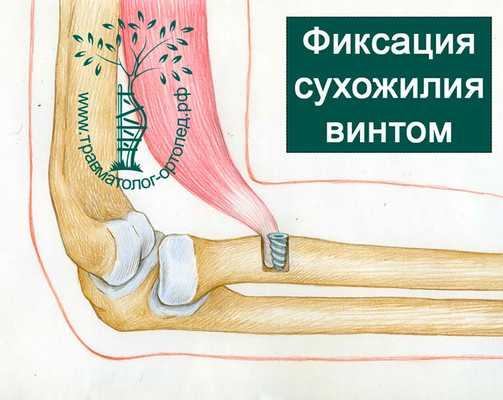Один из методов предполагает рефиксацию сухожилия через единственный доступ по передней поверхности локтевого сустава.