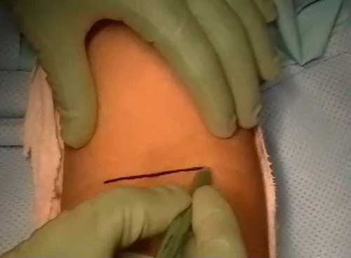 Операция выполняется под проводниковой или общей анестезией (наркозом). При малоинвазивной методике чуть выше и ниже локтевой ямки выполняются два небольших кожных разреза, через которые выделяется оторванное сухожилие, прошивается и фиксируется к лучевой кости.