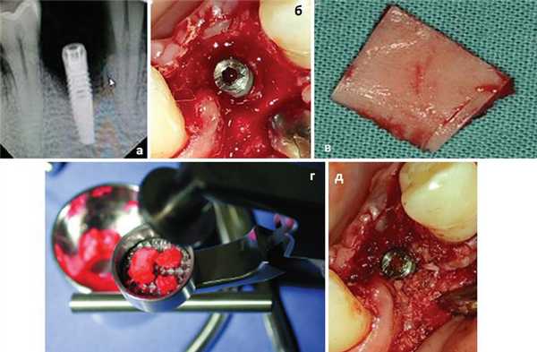 Фото 2. (а) Круговая утрата кости; (б) Дефект вокруг имплантата; (в) Забор кости; (г) Вид костной мельницы; (д) Установка костного трансплантата вокруг титановой инфраконструкции.