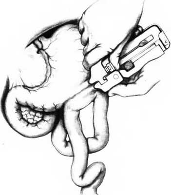 Гастроеюностомию можно выполнить с помощью сшивающего аппарата. Наиболее часто используемая для этого методика заключается в следующем: часть большой кривизны желудка освобождают от желудочно-ободочной связки, находят первую петлю тощей кишки, связку Трейтца и дуоденоеюнальный переход. Проксимальный сегмент тощей кишки проводят впереди поперечной ободочной кишки и располагают параллельно передней стенке желудка около большой кривизны, так чтобы противобрыжеечный край тощей кишки находился в прямом контакте со стенкой желудка. На каждом из концов будущего анастомоза накладывают два серозно-мышечных шва. Электрическим скальпелем делают небольшое отверстие диаметром 1 см в желудке, в 8 см от привратника, другой такой же разрез делают напротив него в тощей кишке. Эти разрезы служат для введения обеих бранш желудочно-кишечного сшивающего аппарата (GIA): одной в желудок, другой в тощую кишку. Бранши аппарата обычно вводят полностью. Некоторые хирурги вводят их на 5-6 см. После того как бранши аппарата введены, их смыкают. Двойной ряд скобок соединяет желудок с тощей кишкой, а лезвие рассекает ткани между двумя рядами скобок, формируя анастомоз. Инструмент удаляют, отверстия в желудке и тощей кишке закрывают сшивающим аппаратом ТА-30 или двумя рядами швов.