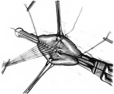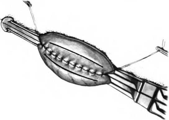 На задние края формируемого анастомоза хромированным кетгутом 2-0 накладывают непрерывный шов с помощью прямой или изогнутой иглы.