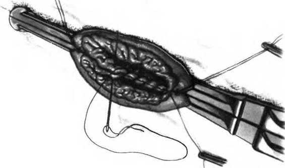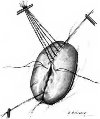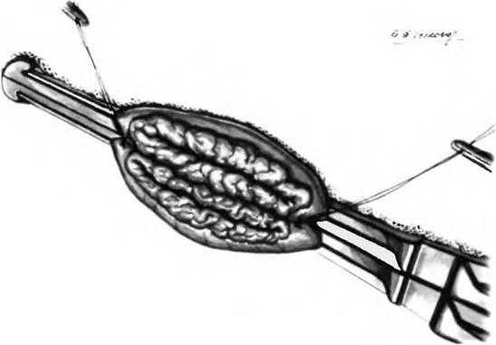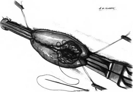 Завершив наложение переднего ряда серозно-мышечных швов, желудок фиксируют клевому краю отверстия