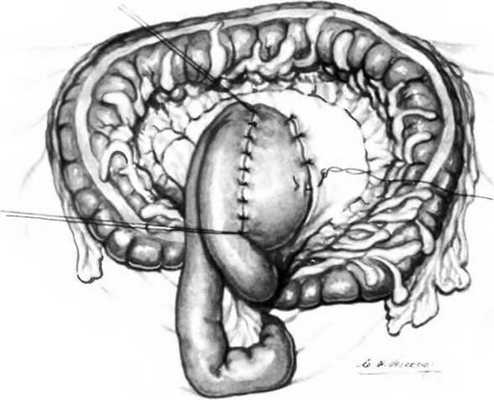 С целью предотвращения порочного круга приводящее колено кишки следует подшить к стенке желудка выше анастомоза рядом узловых серозно-мышечных швов.