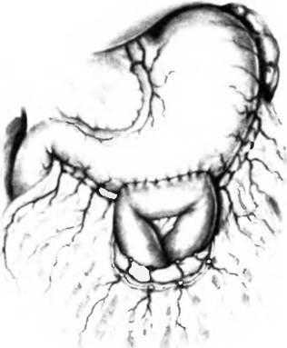При необходимости выполнения гастроеюностомии со стволовой ваготомией у больных с язвой двенадцатиперстной кишки анастомоз следует накладывать как можно ближе к привратнику, около большой кривизны, на короткой приводящей петле, как показано на рисунке.