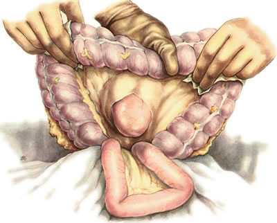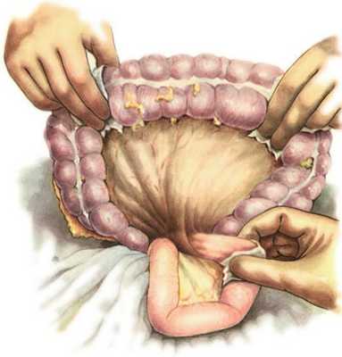 поперечной ободочной кишки и укладывают так,