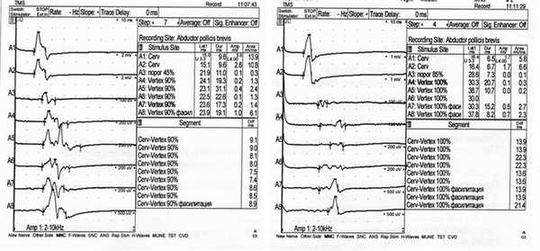 Кроме нейровизуализационных методов, для диагностики спондилогенной миелопатии активно используются ТМС и вызванные ССВП. ТМС позволяла оценивать функцию кортико-спинального пути (рис. 9).