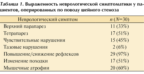 Таблица 1. Выраженность неврологической симптоматики у пациентов, оперированных по поводу шейного стеноза