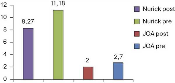 Рис. 4. Оценка неврологического статуса пациентов по шкалам — JOA и Nurick в до- и послеоперационном периоде (пояснение в тексте).