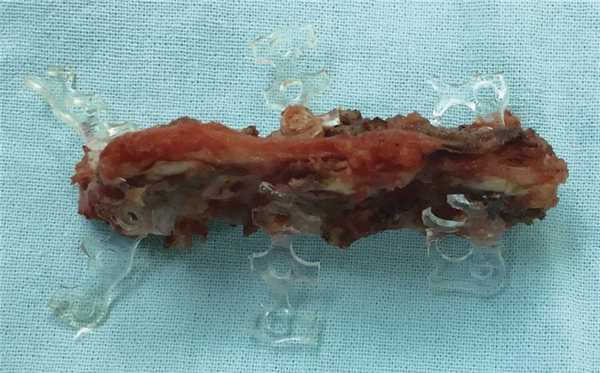 Рис. 1. Ламинотомированный лоскут с зафиксированными пластинами.