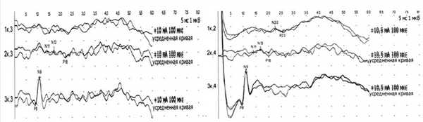 Рис. 10. Исследование ССВП показало, что при стимуляции срединных нервов ответы периферического уровня сохранены. Компоненты спинально-стволового и коркового уровня редуцированы, регистрируются недостоверно, со значительным увеличением латентности и снижением амплитуды, лучше выражены при стимуляции справа (с увеличением центрального времени проведения и интервала N9-N11). Выявляется нарушение проведения афферентации на спинальностволовом уровне: выраженное при стимуляции справа, грубое слева.