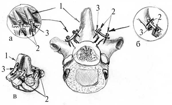 Схематическое изображение метода фиксации ламинотомированного костного лоскута изображено на рис. 3.