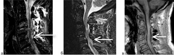 Рис. 12. МРТ пациента П. а — МРТ до операции: стрелкой указана компрессия; б — МРТ того же пациента через 3 мес декомпрессии: стрелка указывает сохранение компрессии на уровне С5; в — МРТ после повторного вмешательства: компрессия ликвидирована.