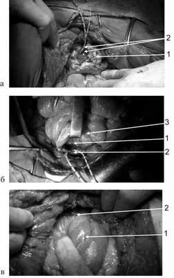 Рис. 1. Интраоперационные фотографии. Этапы энтероцистопластики. а — сохраненное основание мочевого пузыря (1) с уретрой и закатетеризированными мочеточниками (2); б — наложен первый ряд на заднюю стенку анастомоза (1) основания мочевого пузыря (2) со сформированным тонкокишечным резервуаром (3); в — внешний вид сформированного тонкокишечного резервуара (1) с линией анастомоза (2).