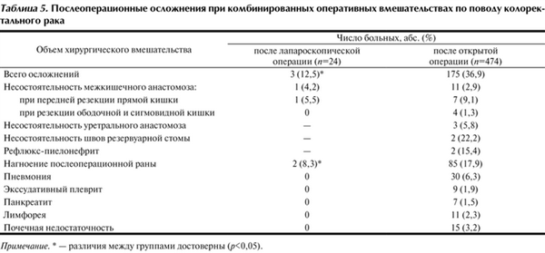 Таблица 5. Послеоперационные осложнения при комбинированных оперативных вмешательствах по поводу колоректального рака Примечание. * — различия между группами достоверны (р<0,05).