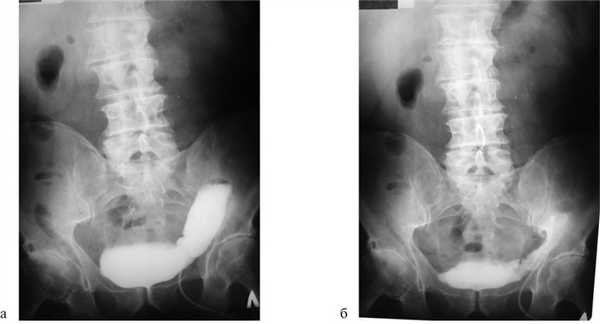 Рис. 2. Рентгенограммы вновь сформированного мочевого пузыря больного Н., 63 лет, через 2 мес после резекции сигмовидной кишки, субтотальной резекции мочевого пузыря с сохранением основания мочевого пузыря с устьями мочеточников и уретрой и тонкокишечной пластикой с наполненным резервуаром (а) и после опорожнения (б).