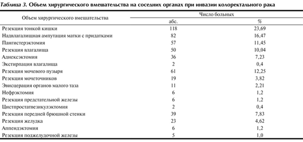 Объем хирургического вмешательства на соседних органах в связи с инвазией колоректальной опухоли в большинстве наблюдений заключался в резекции тонкой кишки, надвлагалищной ампутации матки с придатками, резекции мочевого пузыря, пангистерэктомии (табл. 3).
