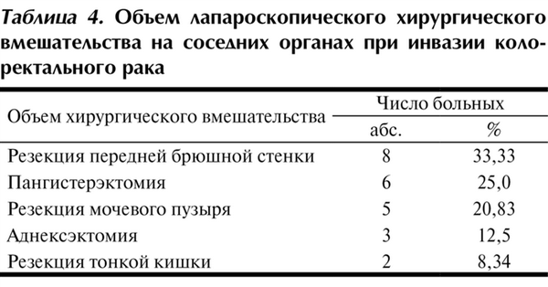 Таблица 4. Объем лапароскопического хирургического вмешательства на соседних органах при инвазии колоректального рака