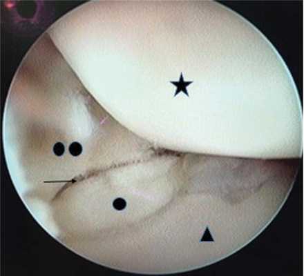 Визуализировали зону ложного сустава (рис. 2). Рис. 2. Артроскопическая анатомия среднезапястного сустава. Звездочкой обозначена ладьевидная кость (scaphoid); треугольником — полулунная кость (lunate); один круг — проксимальный фрагмент ладьевидной кости (the proximal pole of the scaphoid); два круга — дистальный полюс ладьевидной кости (the distal pole of the scaphoid); стрелка — ложный сустав ладьевидной кости (scaphoid pseudarthrosis).