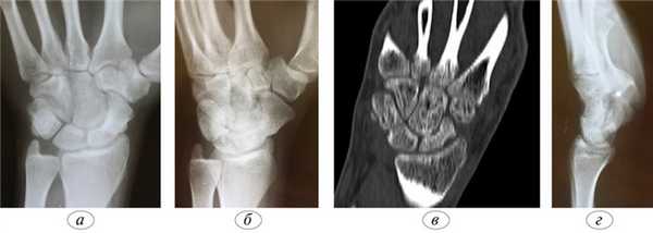 Функция пальцев полная. Сила кулачного схвата правой (доминантной) кисти — 22 кг, снижена почти в 2 раза по сравнению с нормой. Сила схвата левой кисти — 40 кг. Оценка по шкале ВАШ — 3 балла, по опроснику DASH — 21,16 балла. На рентгенограмме (рис. 5, а, б, в) и при компьютерной томографии выявлен ложный сустав ладьевидной кости (см. рис. 6, г). Рис. 6. Пациент К., 19 лет. Диагноз: ложный сустав ладьевидной кости правой кисти. а — рентгенограмма в прямой проекции; б — рентгенограмма в ¾; в — рентгенограмма в боковой проекции; г — компьютерная томография.