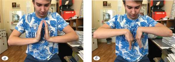 При осмотре: контуры правого кистевого сустава не изменены, локальная боль в области «анатомической табакерки». Движения в кистевом суставе -80/0/50 (рис. 5, а Рис. 5. Пациент К., 19 лет. Диагноз: ложный сустав ладьевидной кости правой кисти. Функция кистевого сустава до операции: а — разгибание кисти; б — сгибание кисти. и 7, б).