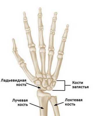 Запястье состоит из восьми мелких костей, известных как кости запястья. Кости запястья образуют два ряда по четыре кости в каждом, которые располагаются между пястными костями и костями предплечья (лучевой и локтевой). Ладьевидную кость можно пропальпировать в области "анатомической табакерки». Эта точка расположена между сухожилиями длинного разгибателя большого пальца и длинной отводящей мышцы.