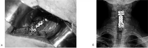 Рис. 2. Корпорэктомия позвонка СV с замещением дефекта раздвижным эндопротезом тела позвонка. а — интраоперационная фотография; б — послеоперационная рентгенограмма шейного отдела позвоночника.