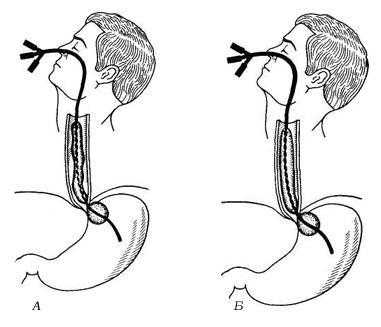Рис. Зонд Блэкмора при пищеводном кровотечении из варикозно-расширенных вен пищевода: а — до раздутия баллонов водой; б — после введения жидкости
