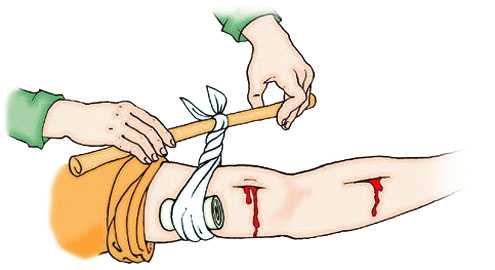 Подручными средствами конечность перетягивают так же как резиновым жгутом, либо делают закрутку, конец которой прибинтовывают к конечности.