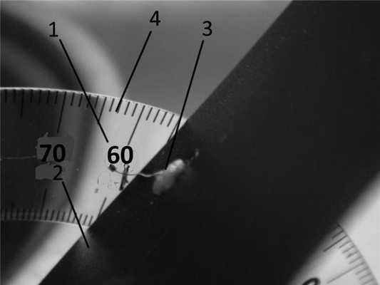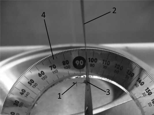 Результаты экспериментов показали, что в опытной группе, где для укрепления протеза применялась лазерная сварка с использованием ОТП, при любом наклоне плоской поверхности протез не отклоняется от своего первоначального положения (рис. 2). Рисунок 2. Протез, фиксированный с помощью ОТП, обработанной лазером. 1 — титановый протез; 2 — пластмассовая поверхность; 3 — сгусток ОТП, обработанный лазером; 4 — транспортир для измерения угла отклонения протеза от исходного положения.