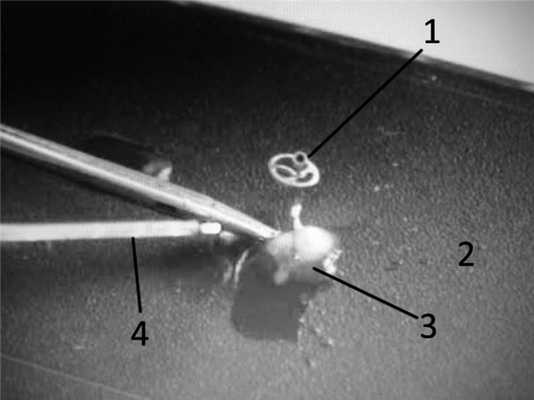 Обогащенную тромбоцитами плазму с разных сторон облучали 3—4 импульсами длительностью 1—2 с при мощности 2 Вт. Рабочий конец волновода располагали на расстоянии 3—4 мм от сгустка ОТП (рис. 1). Рисунок 1. Техника фиксации протеза с помощью ОТП, коагулированной лазерным лучом. 1 — титановый протез; 2 — пластмассовая поверхность; 3 — сгусток ОТП; 4 — лазерное волокно.