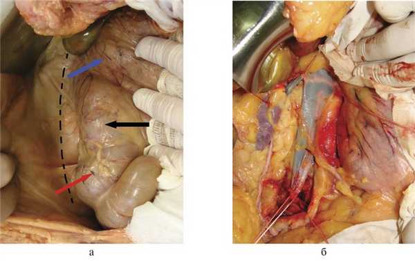 Рис. 4. Аутопсийные фотографии. а — правосторонний доступ. Пунктиром обозначена линия разреза брюшины вдоль восходящей ободочной кишки, красная стрелка — слепая кишка, черная стрелка — восходящая ободочная кишка, синяя стрелка — двенадцатиперстная кишка; б — вид операционного поля после выполнения доступа.
