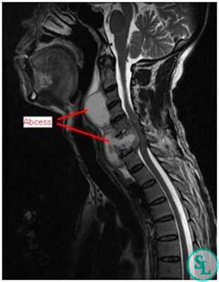 Спондилодисцит шейного отдела может проявляться дисфагией или кривошеей.