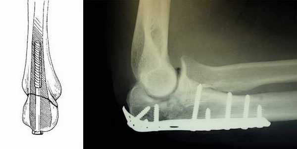 (Слева) Для фиксации перелома локтевого отростка можно использовать один винт, который вводится в костномозговой канал. (Справа) Фиксация перелома пластиной и винтами.
