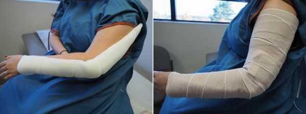 (Слева) Локтевой сустав фиксируется шиной от верхней трети плеча до кисти. (Справа) Шина фиксируется на руке эластичным бинтом.