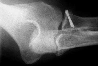 Удаление костного фрагмента. Если костный фрагмент слишком мал и фиксировать его невозможно, иногда приходится его удалять. В таком случае прикрепляющееся к фрагменту сухожилие трехглавой мышцы рефиксируется к оставшейся части локтевой кости.
